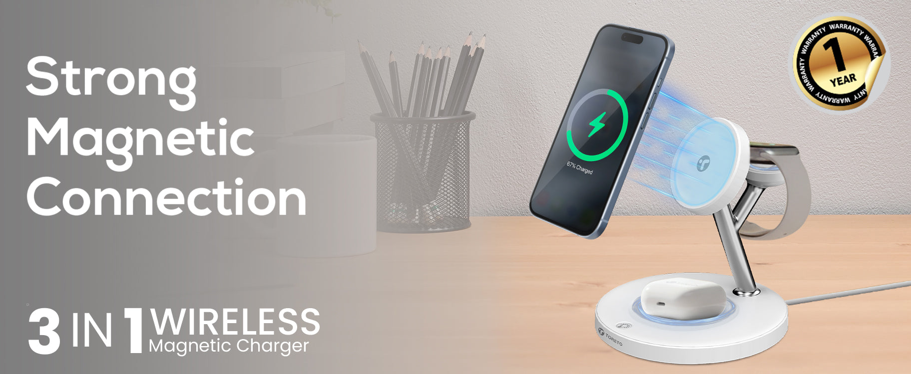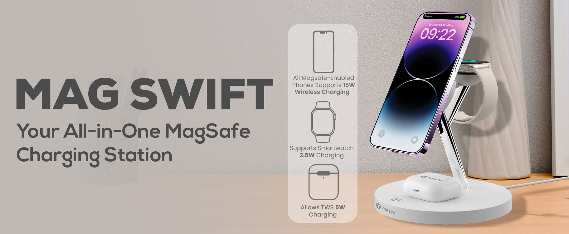 Charging Type: 3-in-1 wireless magnetic charger for phone, earbuds, and smartwatch