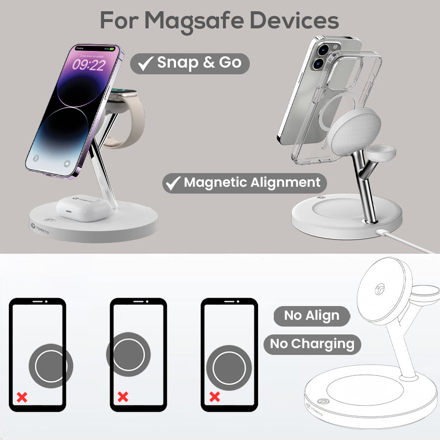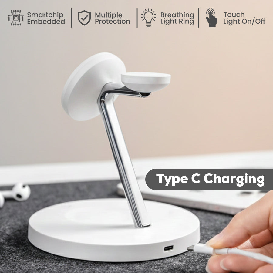 3-in-1 wireless magnetic charger with MagSafe compatibility, 15W fast wireless charging support, smart chip technology, multiple protection systems, and Type-C charging