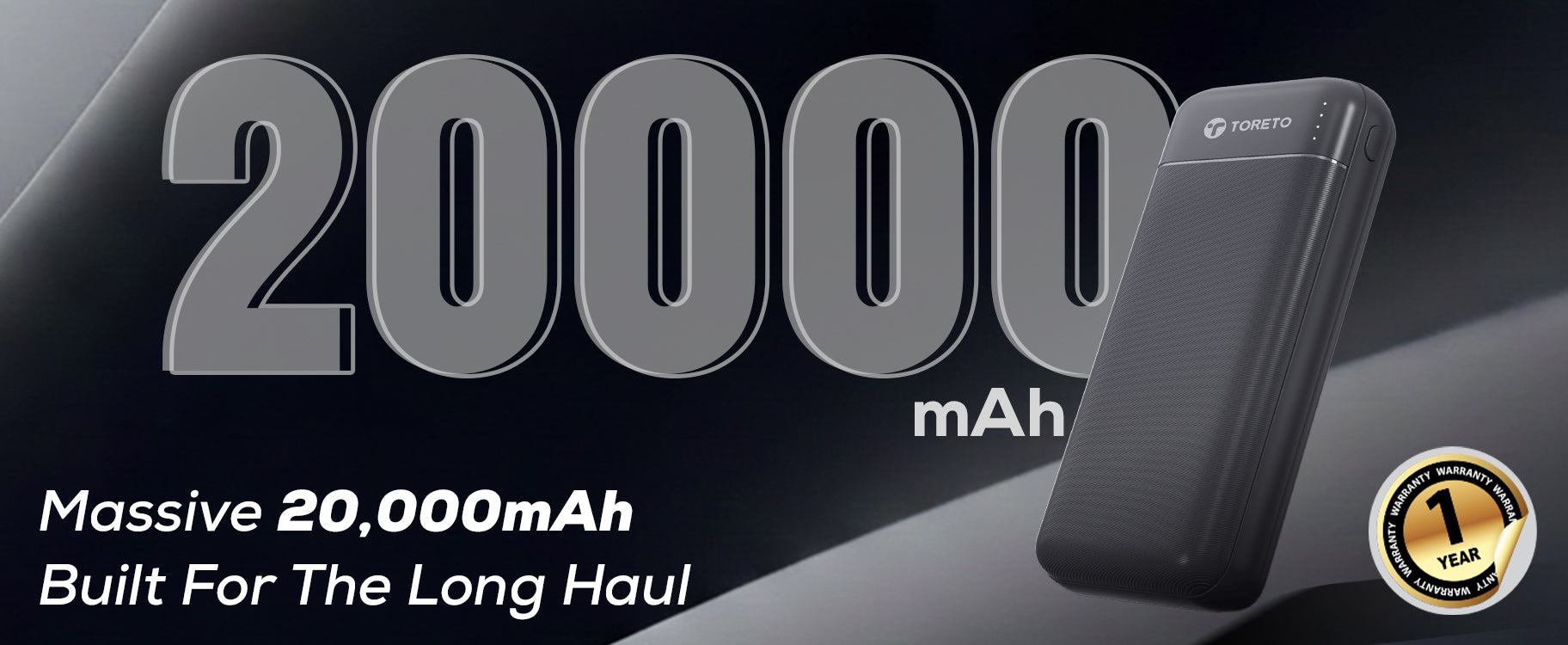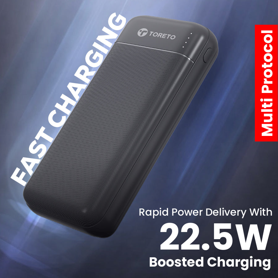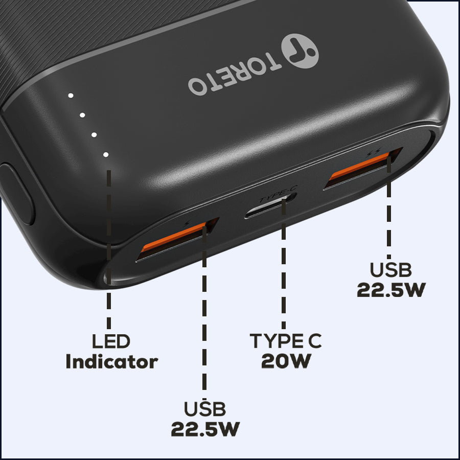 Portable 20,000mAh powerbank with 22.5W high-speed output, multi-protocol fast charging support, built-in Type-C cable, LED battery indicator, and dependable power backup for extended daily use.