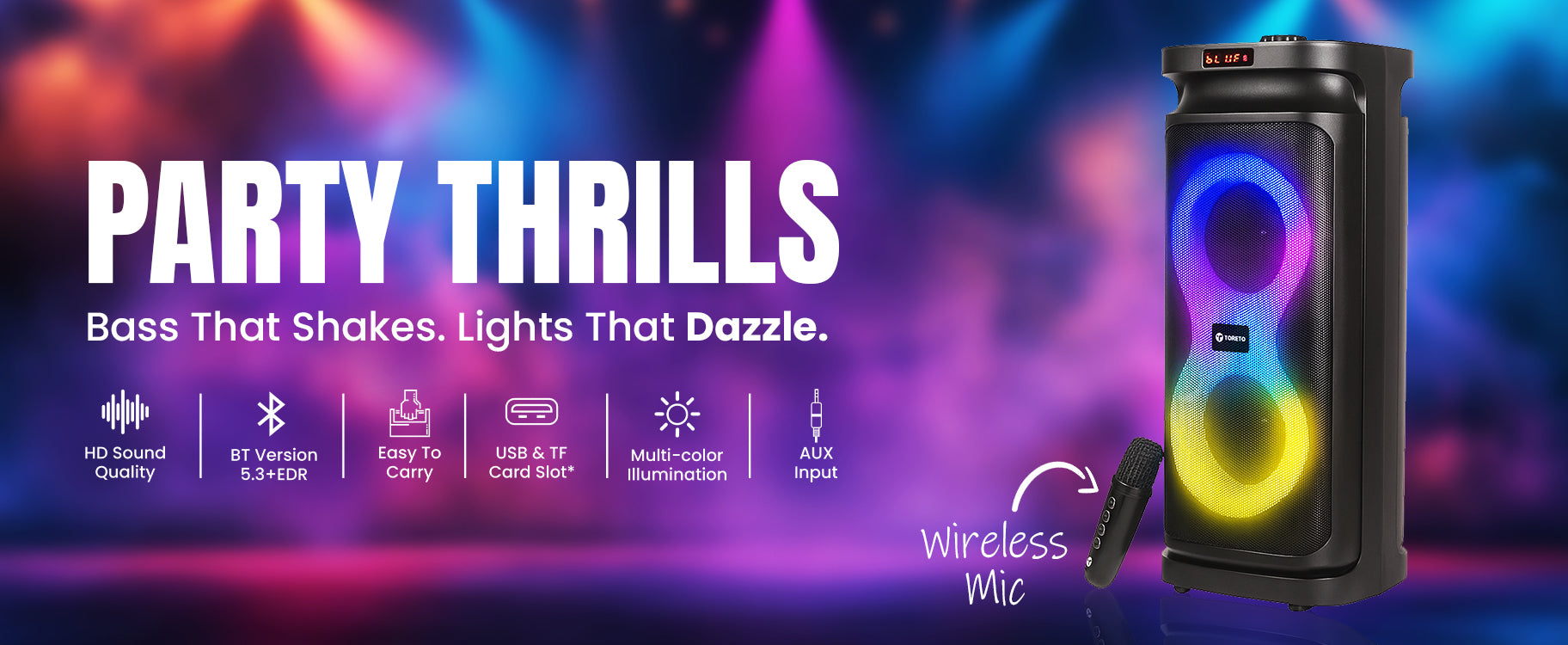 The Toreto Party Thrillz Bluetooth speaker delivers 30W of clear, powerful audio, perfect for small to medium-sized parties and gatherings.