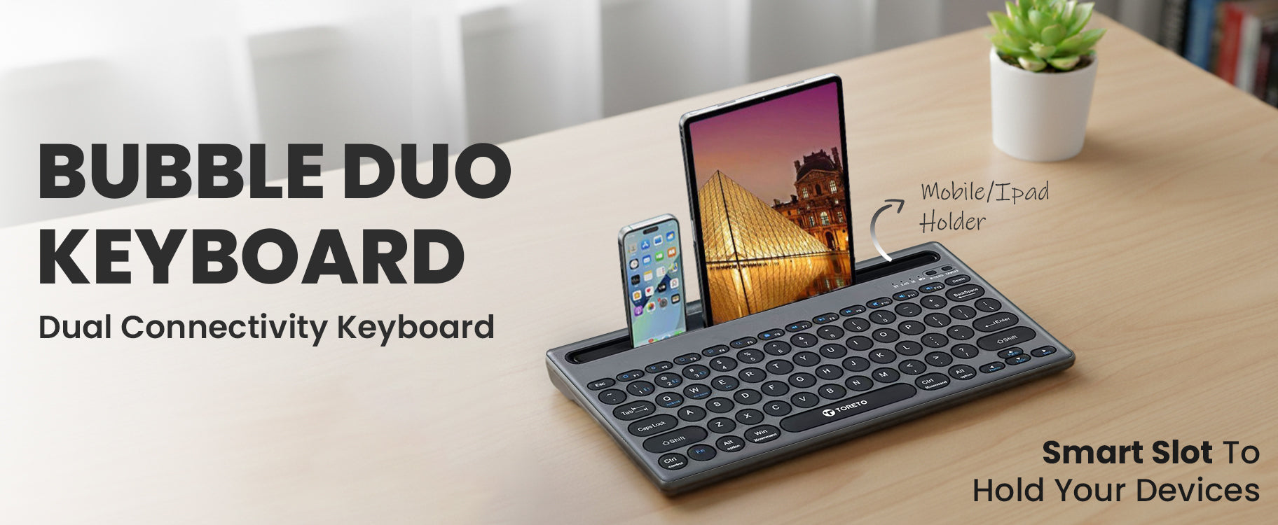 Wireless Keyboard with Bluetooth 5.0 & 2.4 GHz Connectivity, Smart Slot Holder, and Type-C Charging