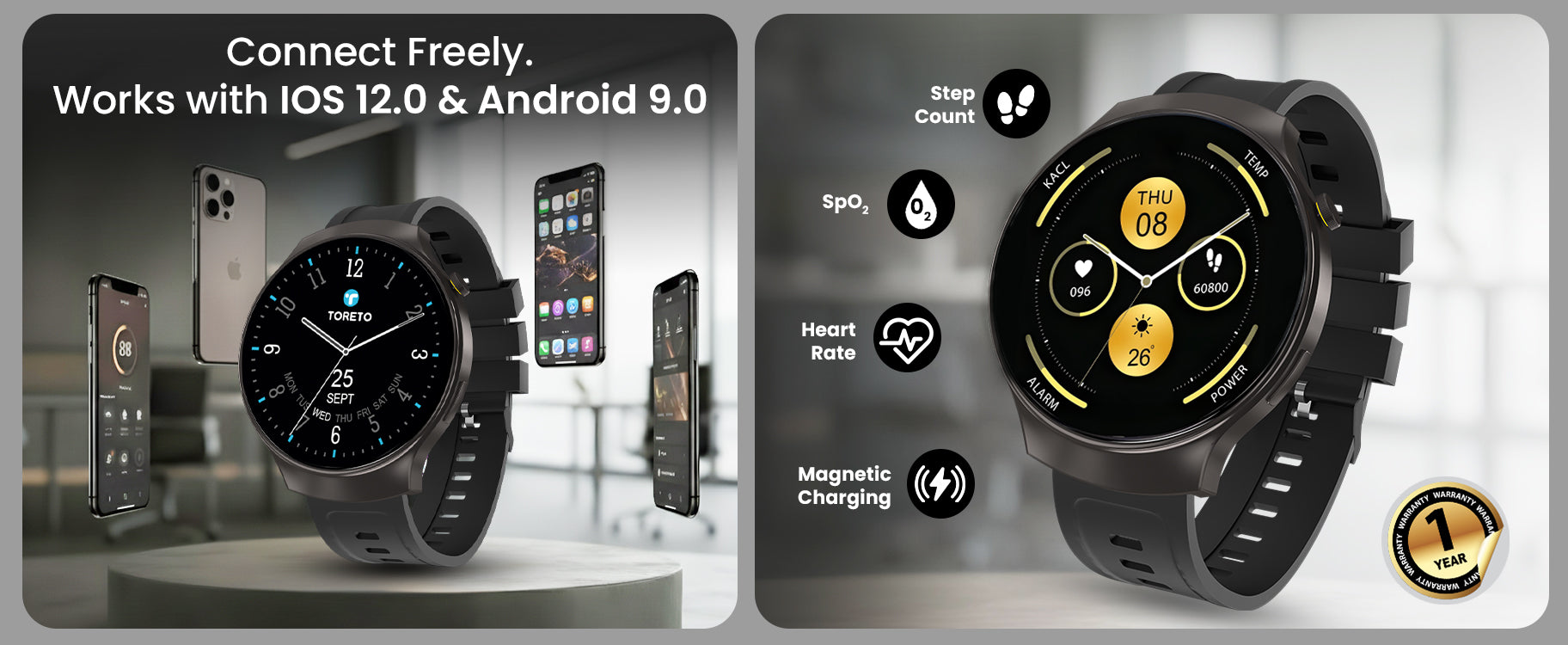 Yes, the Toreto Eclipz S smartwatch supports Android 9.0 and above, and iOS 12.0 and above. It connects seamlessly to most smartphones, enabling access to features like Bluetooth calling, health tracking, and notifications.
