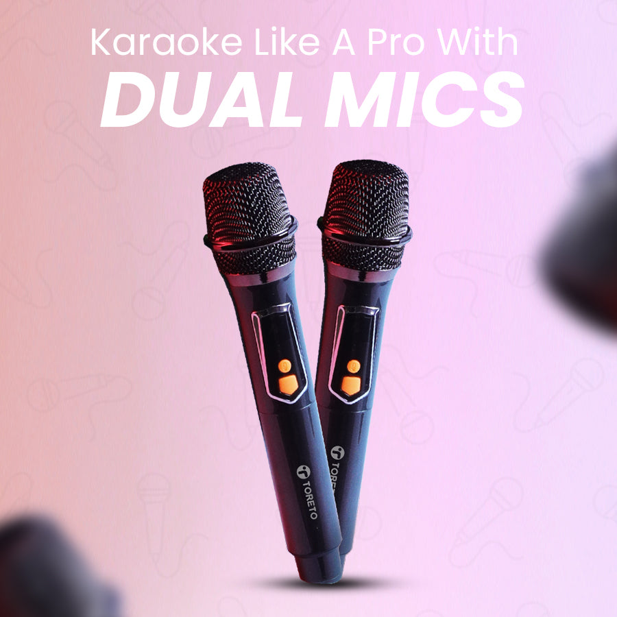 Microphones: Dual wireless mics included