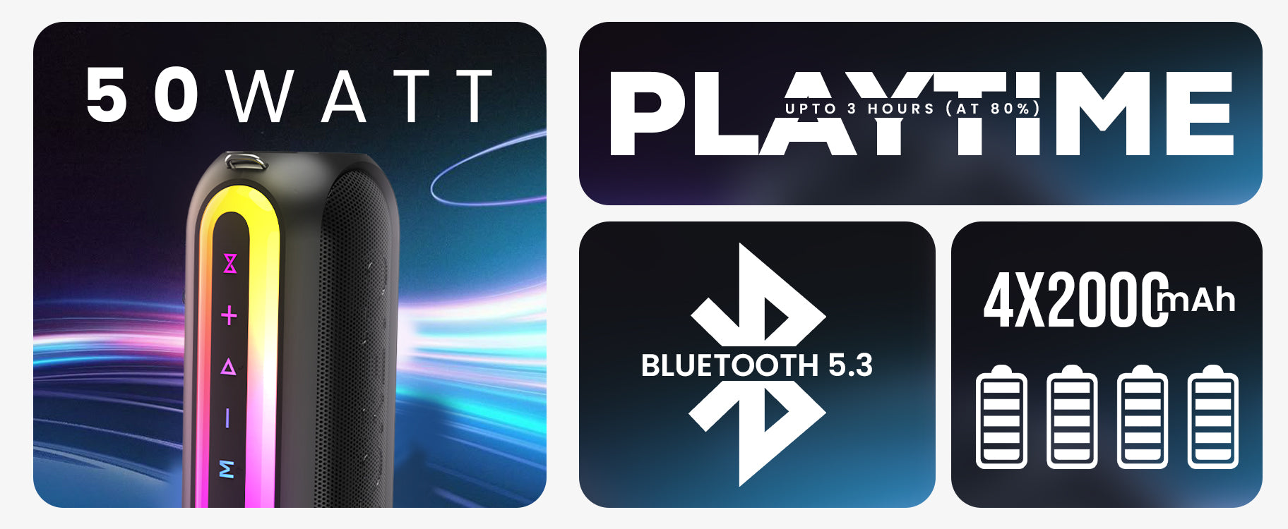 The Toreto Party Dynamo Bluetooth speaker is equipped with four 2000mAh rechargeable batteries that recharge in less than 3 hours with Type-C charging support.
