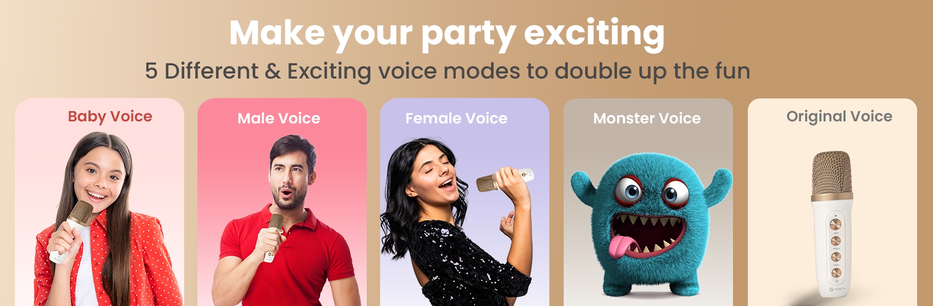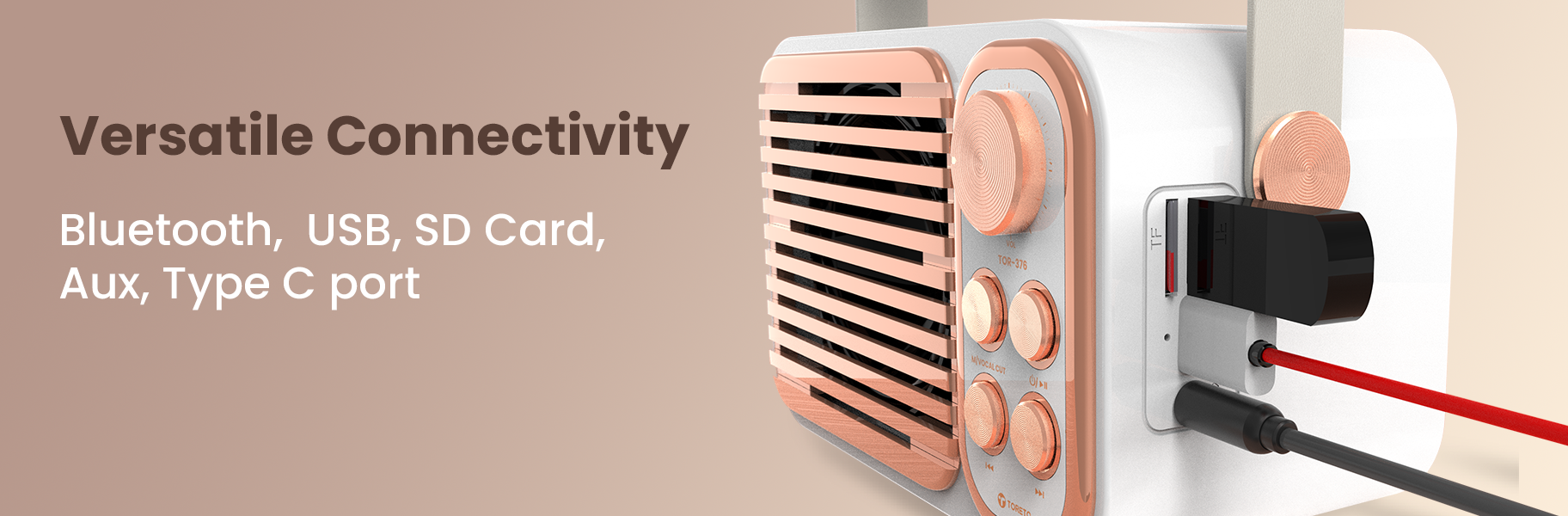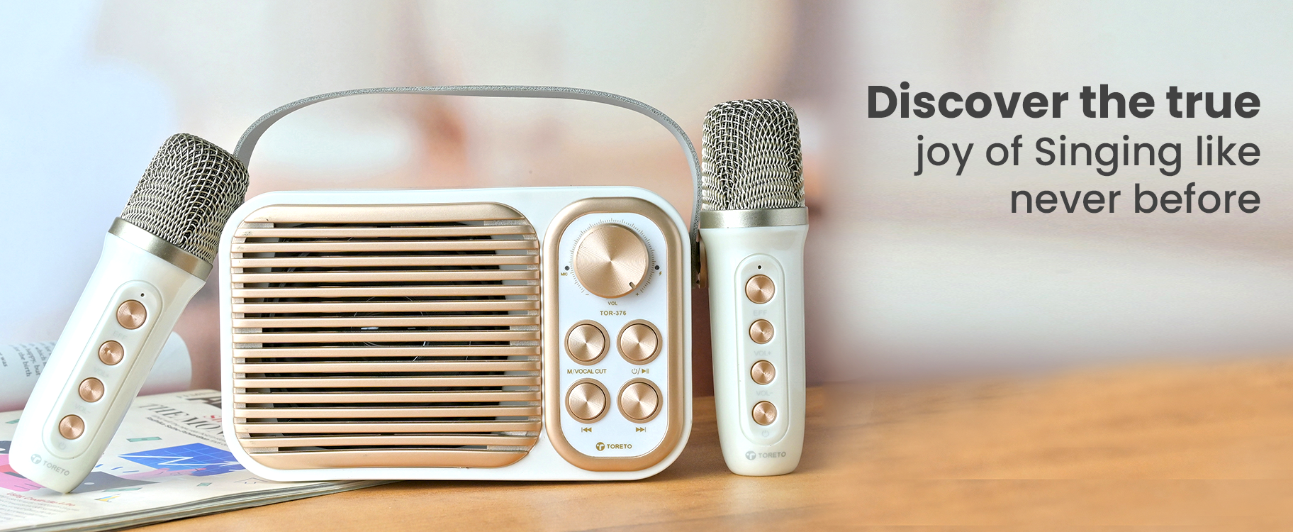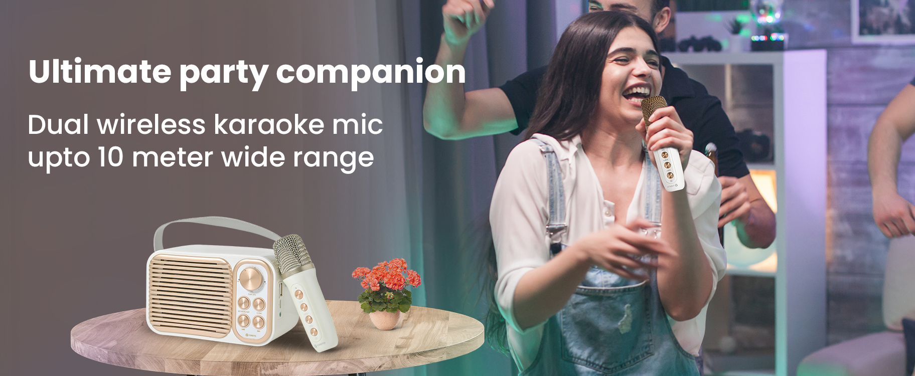 Portable Bluetooth speaker with 14W HD sound, dual karaoke mics, and 6-hour playtime