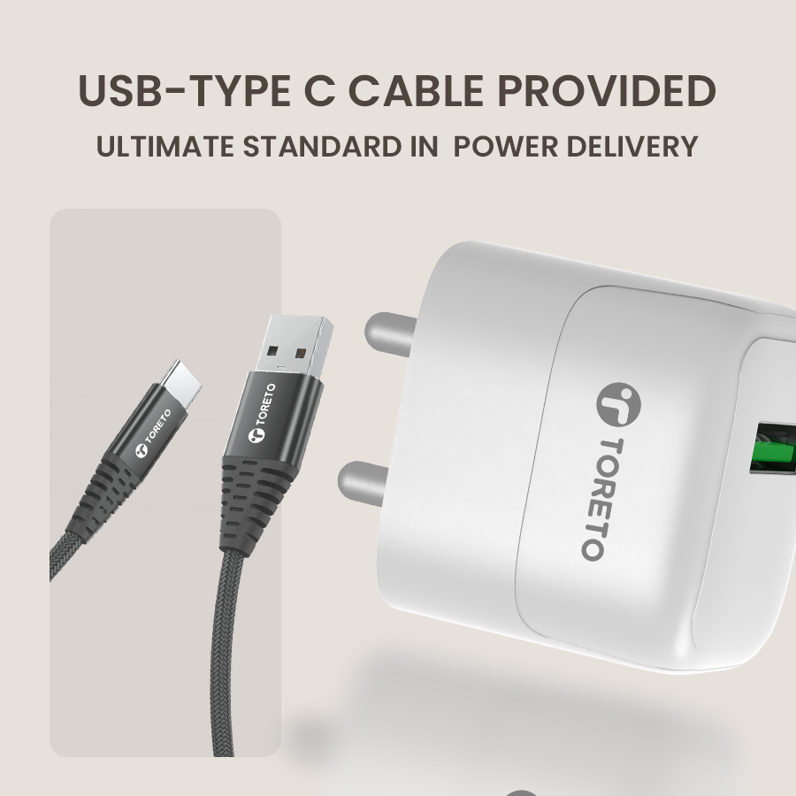 Fast charger with 15W power output, USB to Type-C cable, USB Port, compact and durable design.