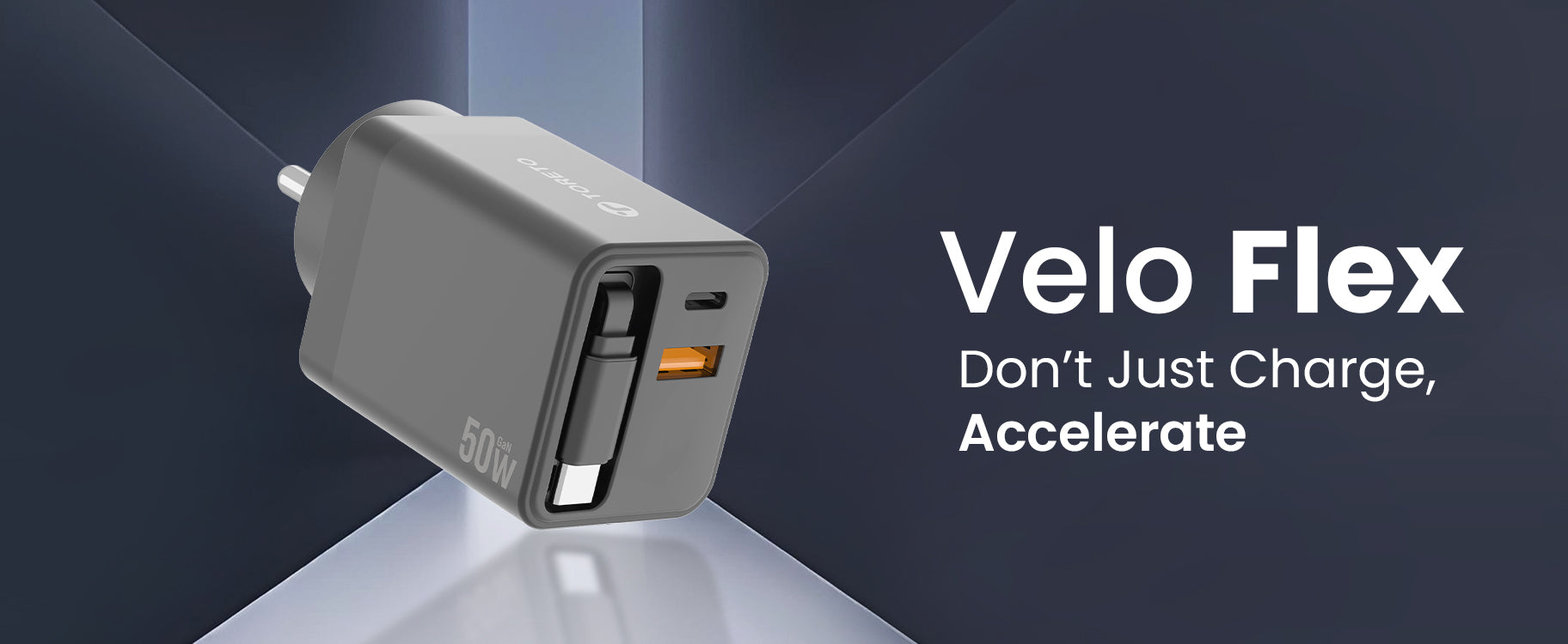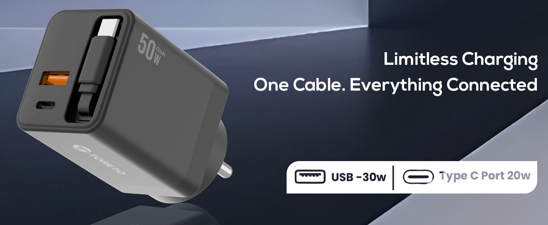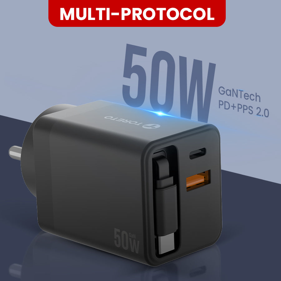 Fast charger with 50W power output, retractable Type-C cable, SuperVOOC fast charging, 20W PD output, 30W USB output
