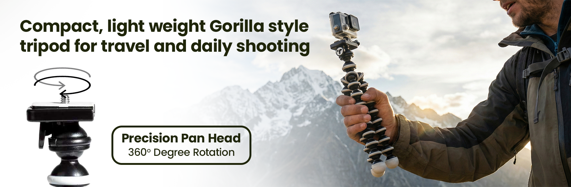 The 360° ball head is integrated for stability and features a standard 1/4-inch mounting thread, allowing compatibility with accessories such as LED lights or microphones.