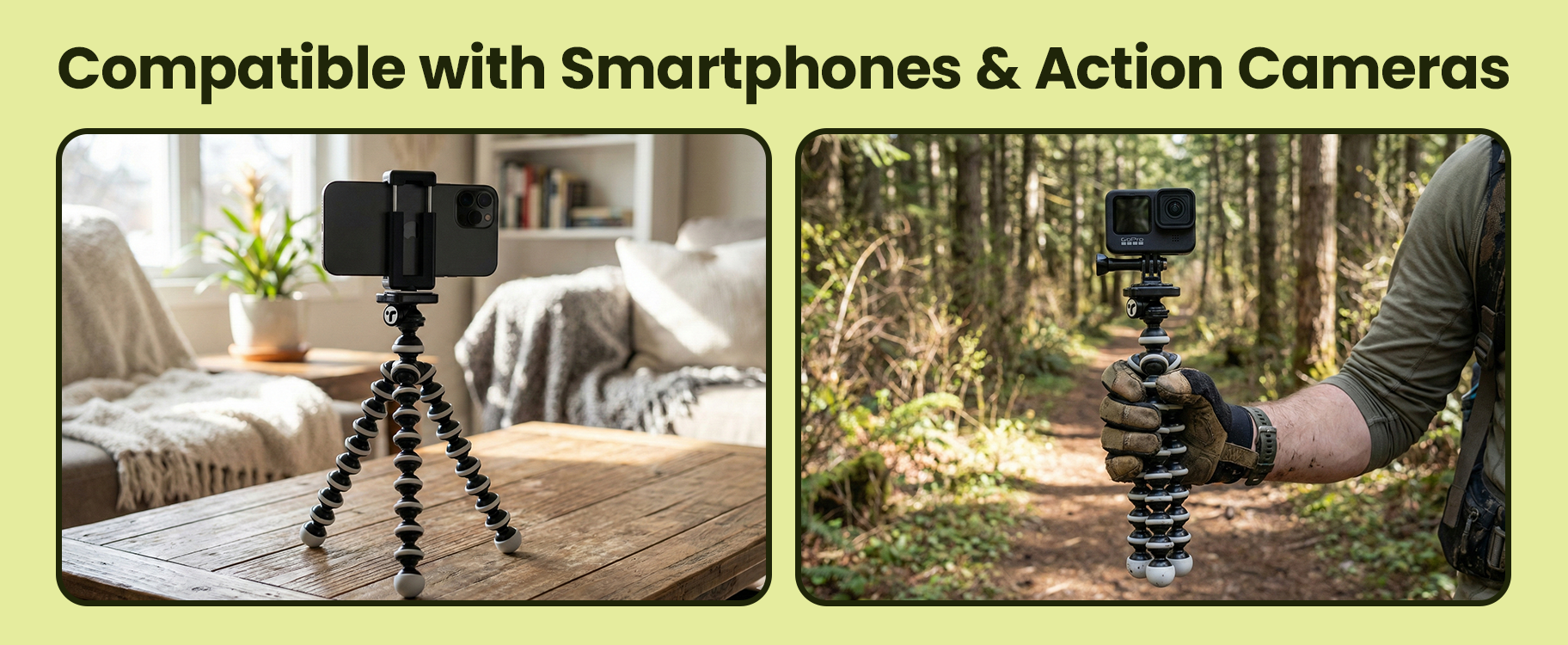 The mini tripod is optimized for smartphones, action cameras, and compact mirrorless cameras. It can support entry-level DSLRs with small lenses, provided the total weight does not exceed approximately 1.5 kg.