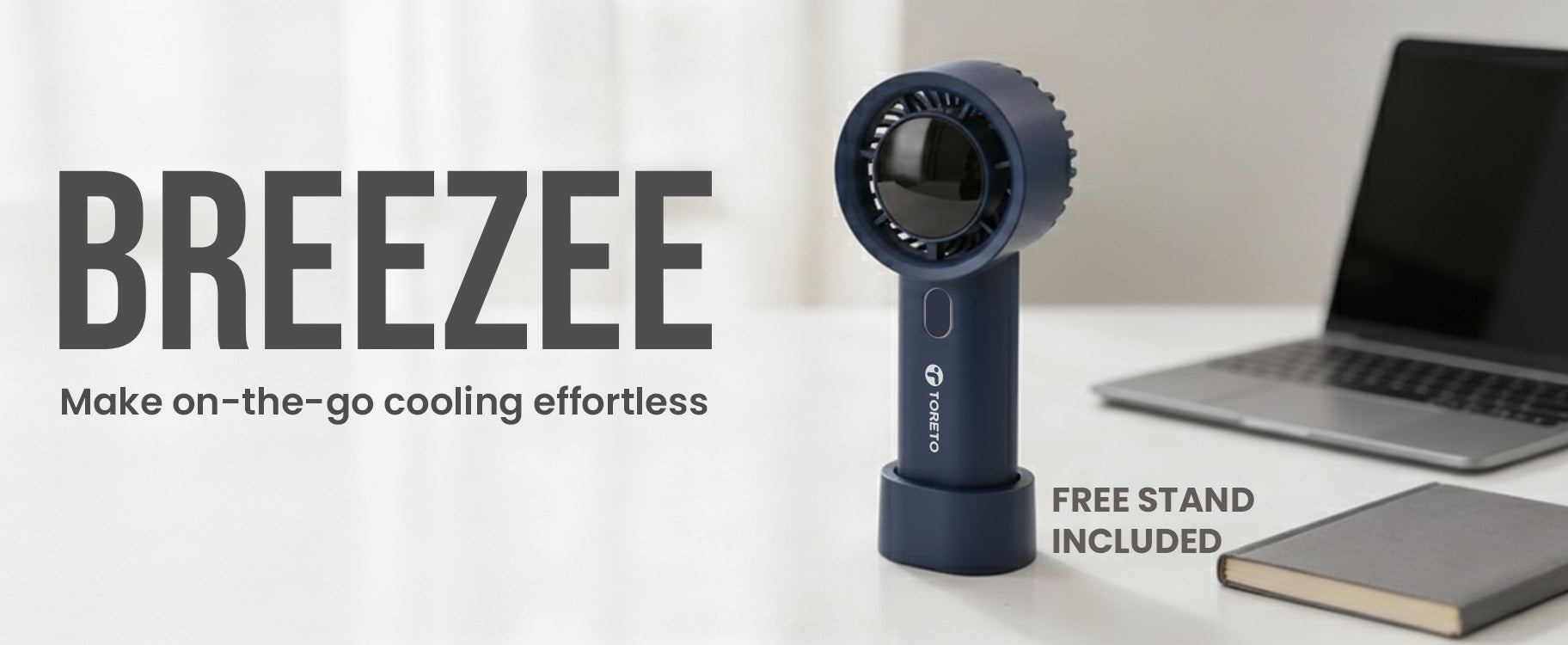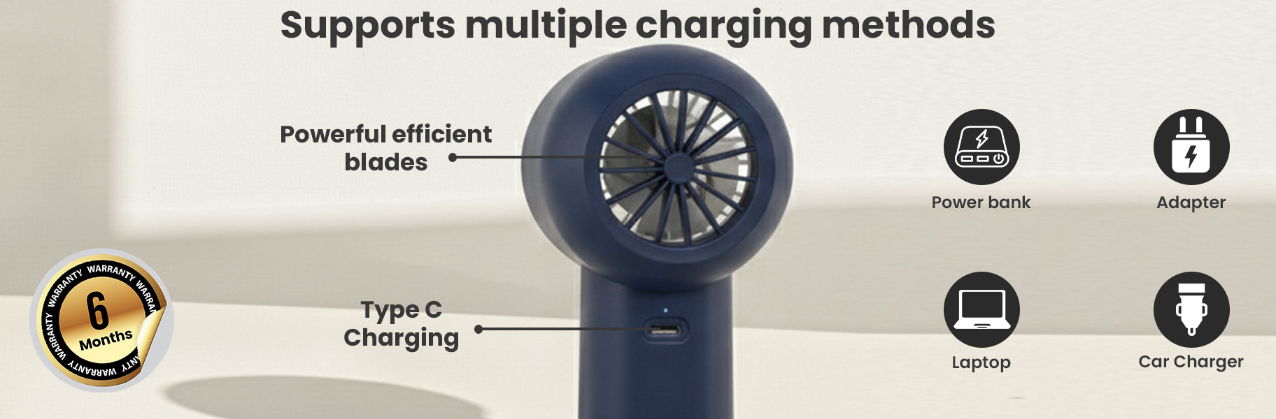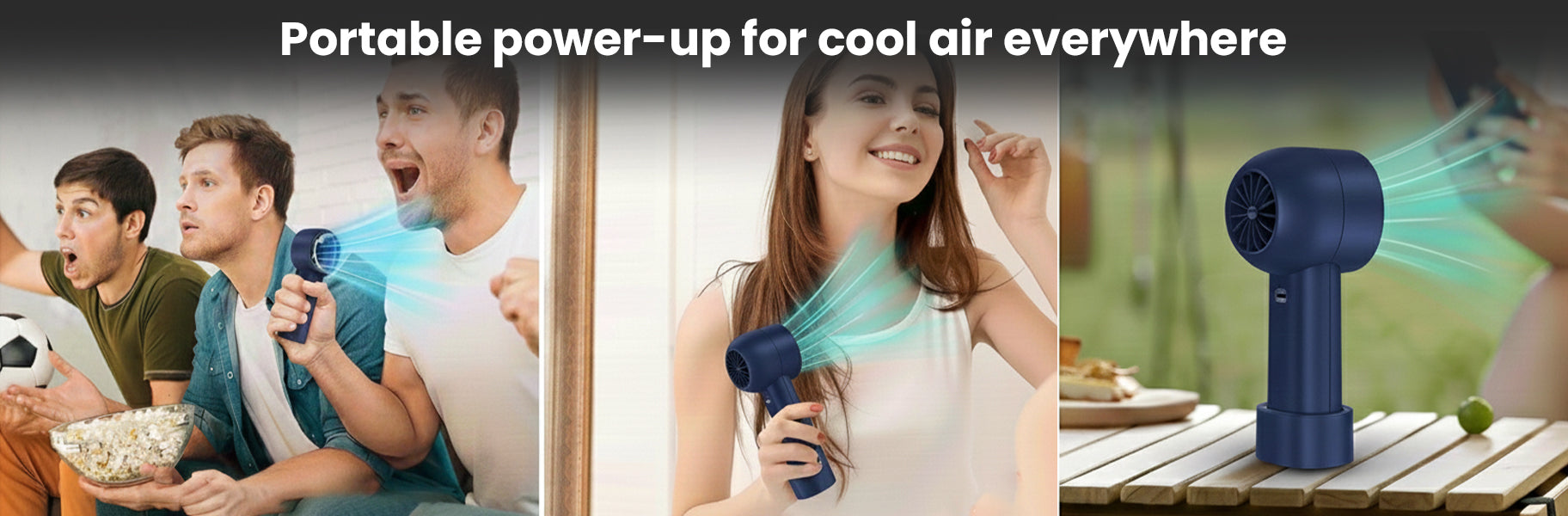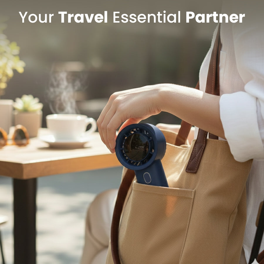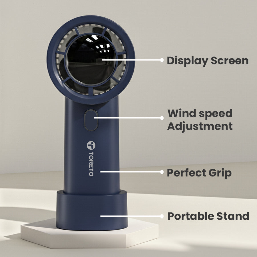Portable hand fan with powerful and efficient blades, adjustable wind speed, display screen, turbo drive performance, Type-C charging support, and travel-friendly design