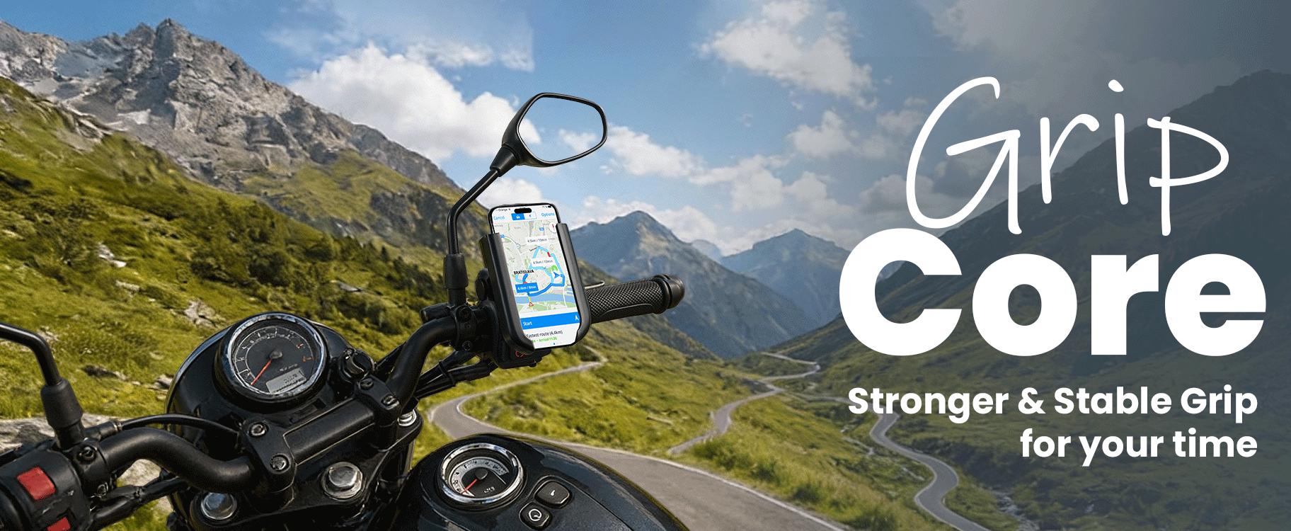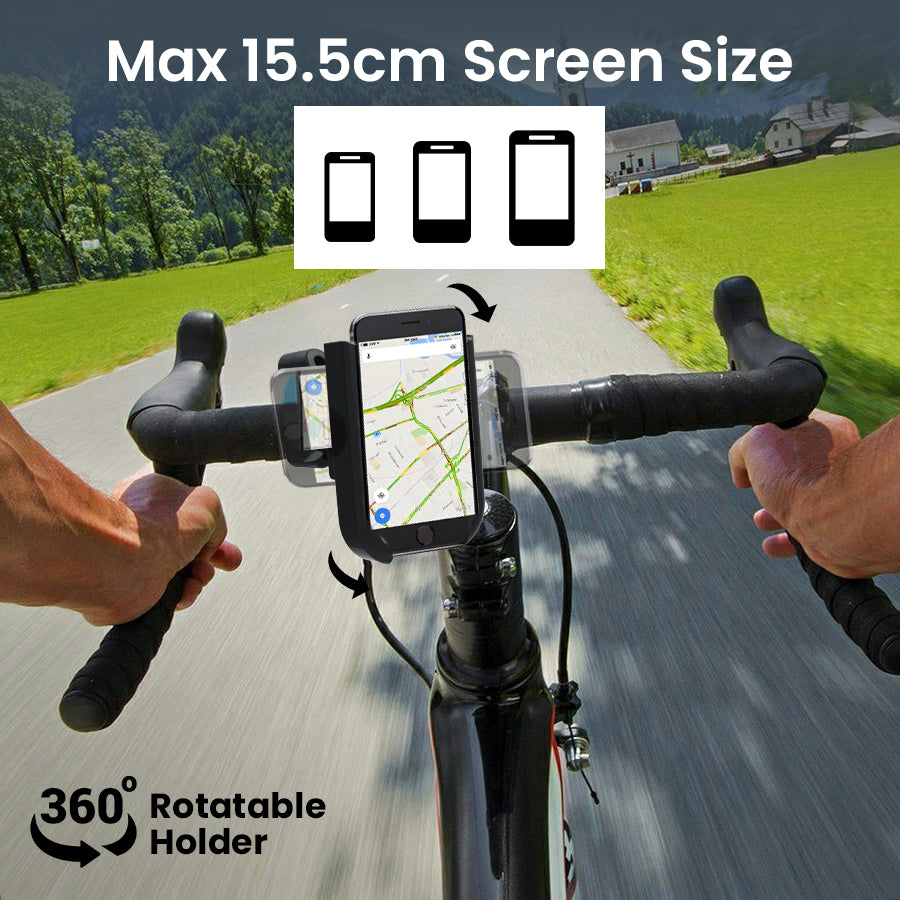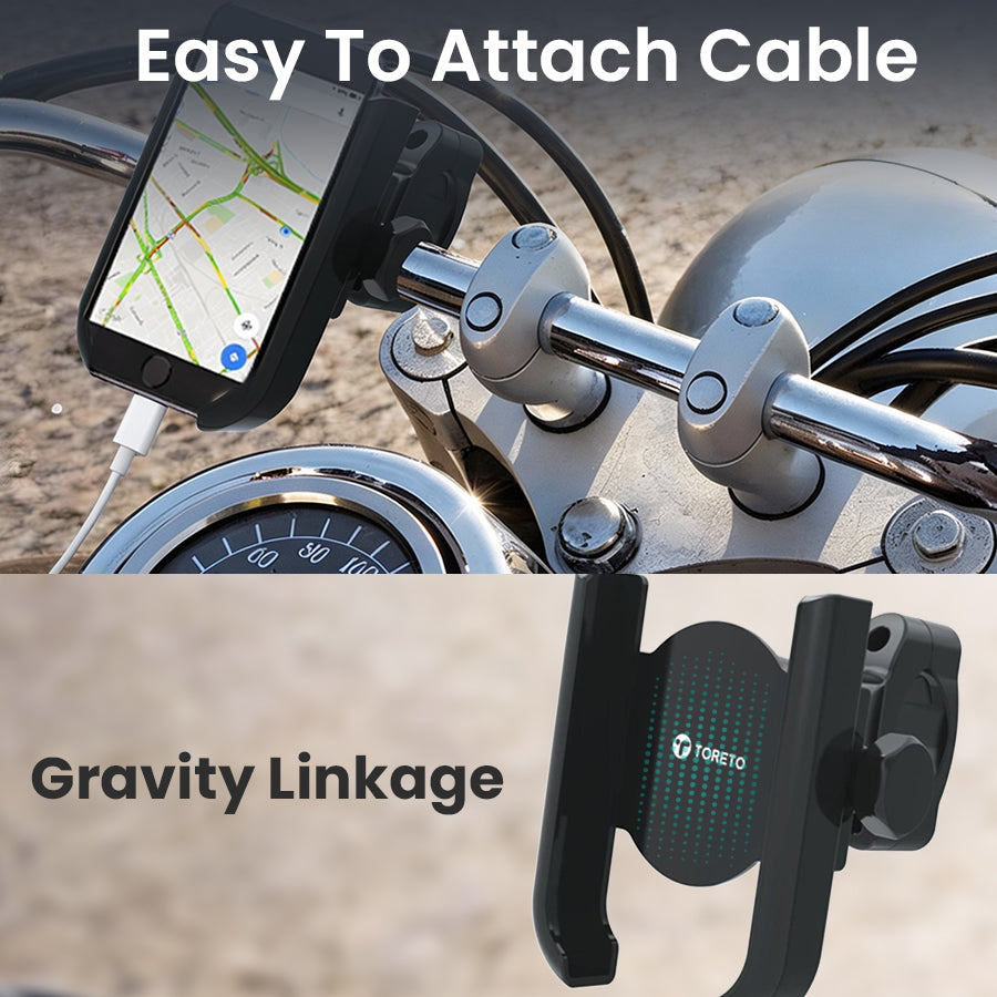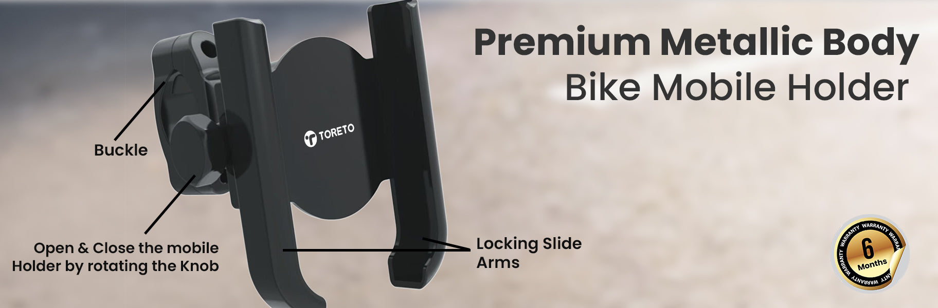 Premium bike mobile holder with strong vacuum grip, gravity linkage mechanism, locking slide arms, 360° rotation, and durable metallic body