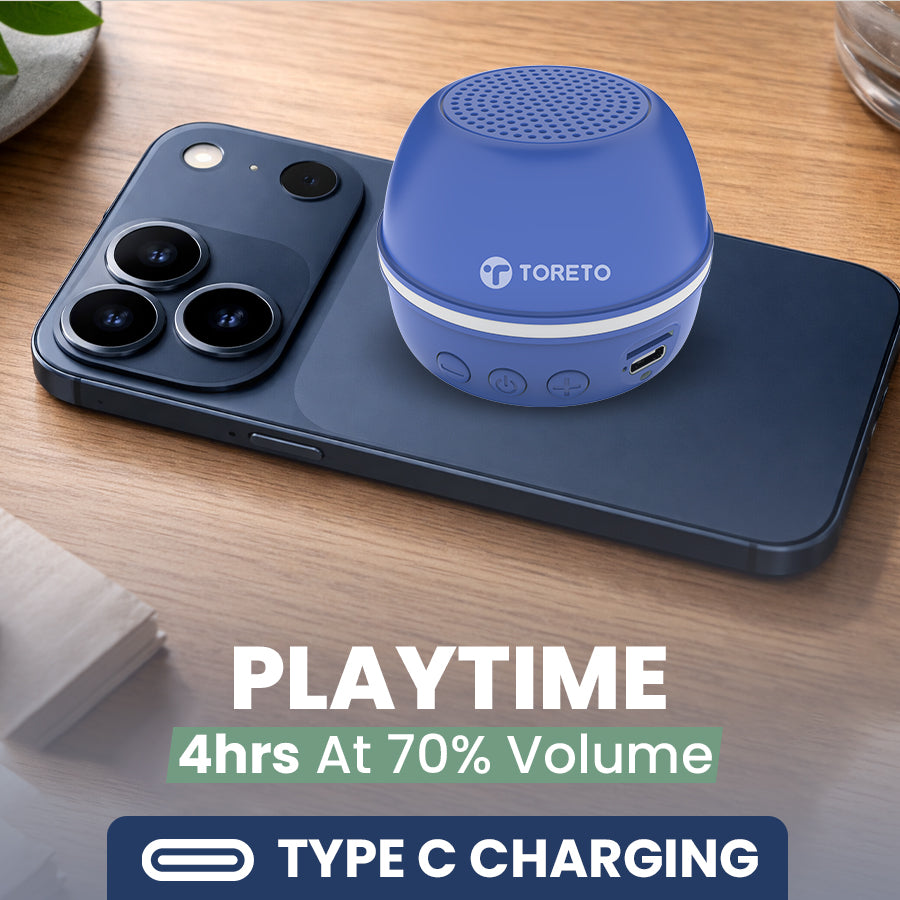 The Toreto MagnoBeat Bluetooth speaker is powered by an 800 mAh battery, offering up to 4 hours of playback at 80% volume on a single charge.