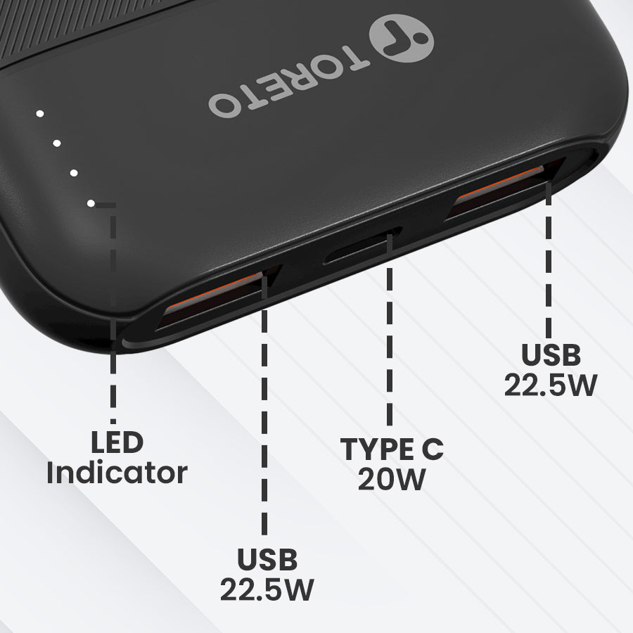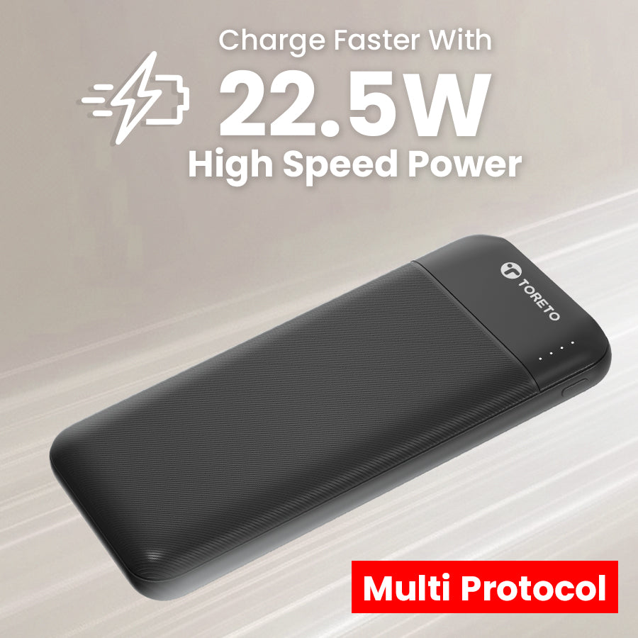 Portable 10,000mAh powerbank with 22.5W high-speed output, multi-protocol fast charging support, built-in Type-C cable, LED battery indicator, and reliable everyday portability.