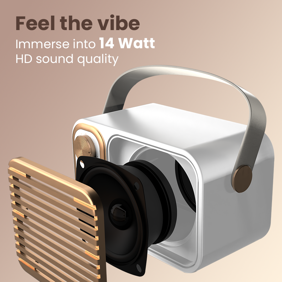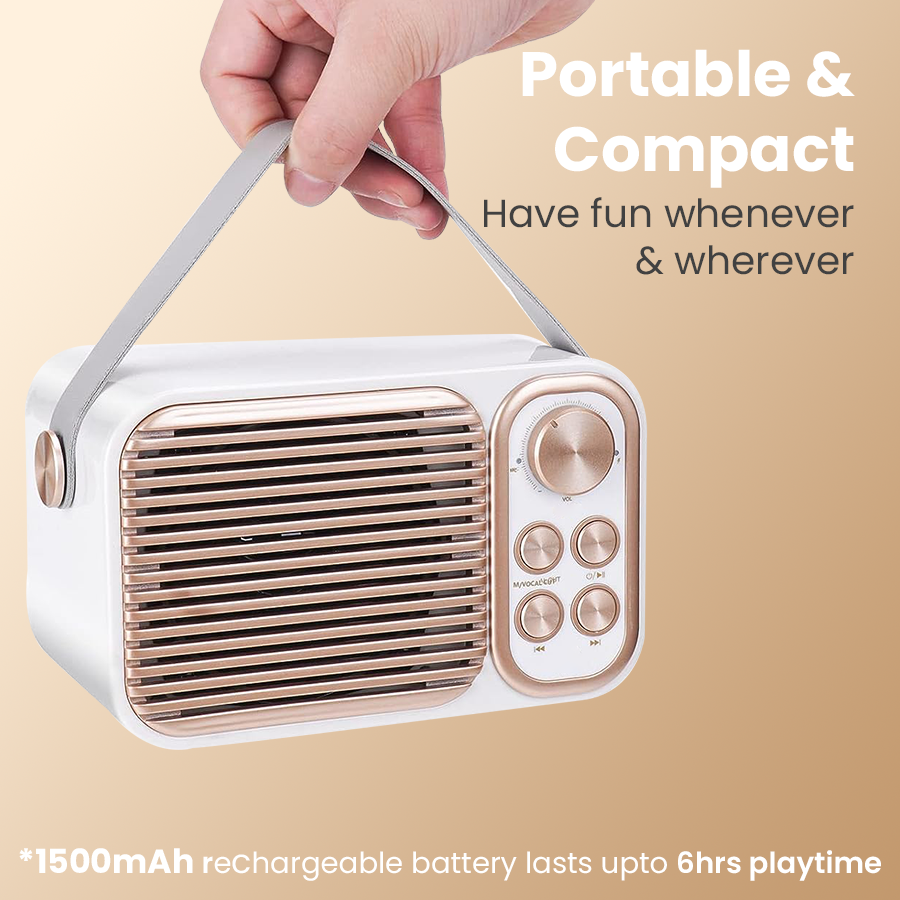 Portable Bluetooth speaker with 14W HD sound, dual karaoke mics, and 6-hour playtime