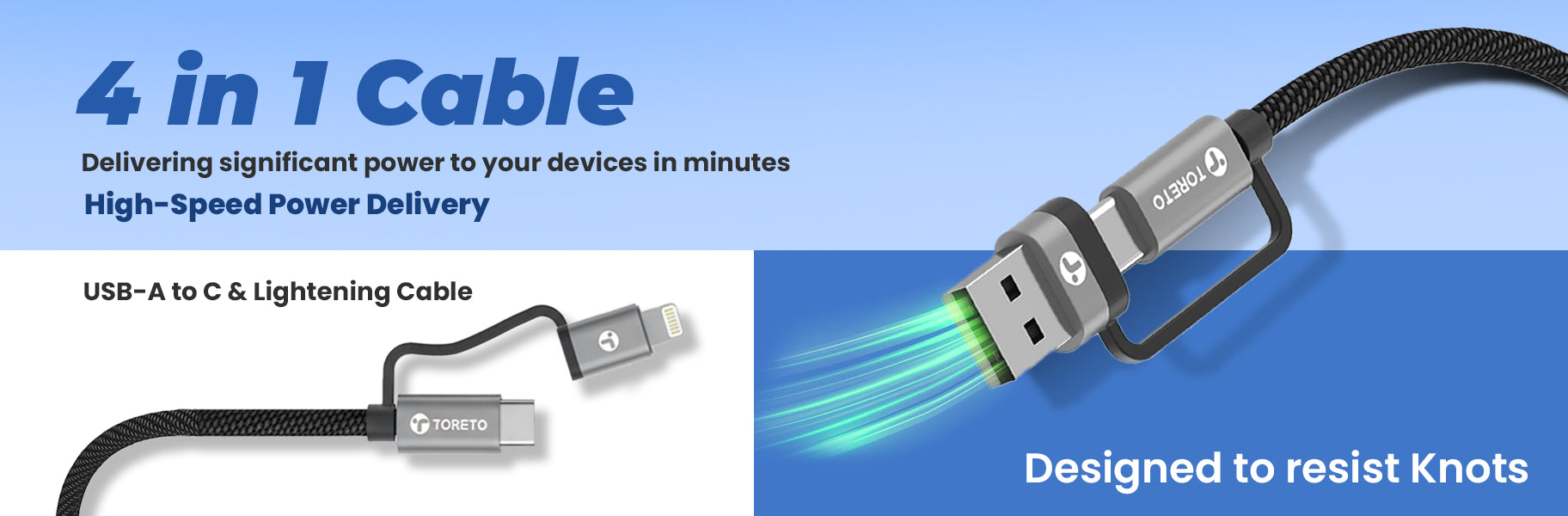 The Toreto TuffCord 3 cable features one side with Type-C and Lightning connectors, and the other side with USB and Type-C connectors.