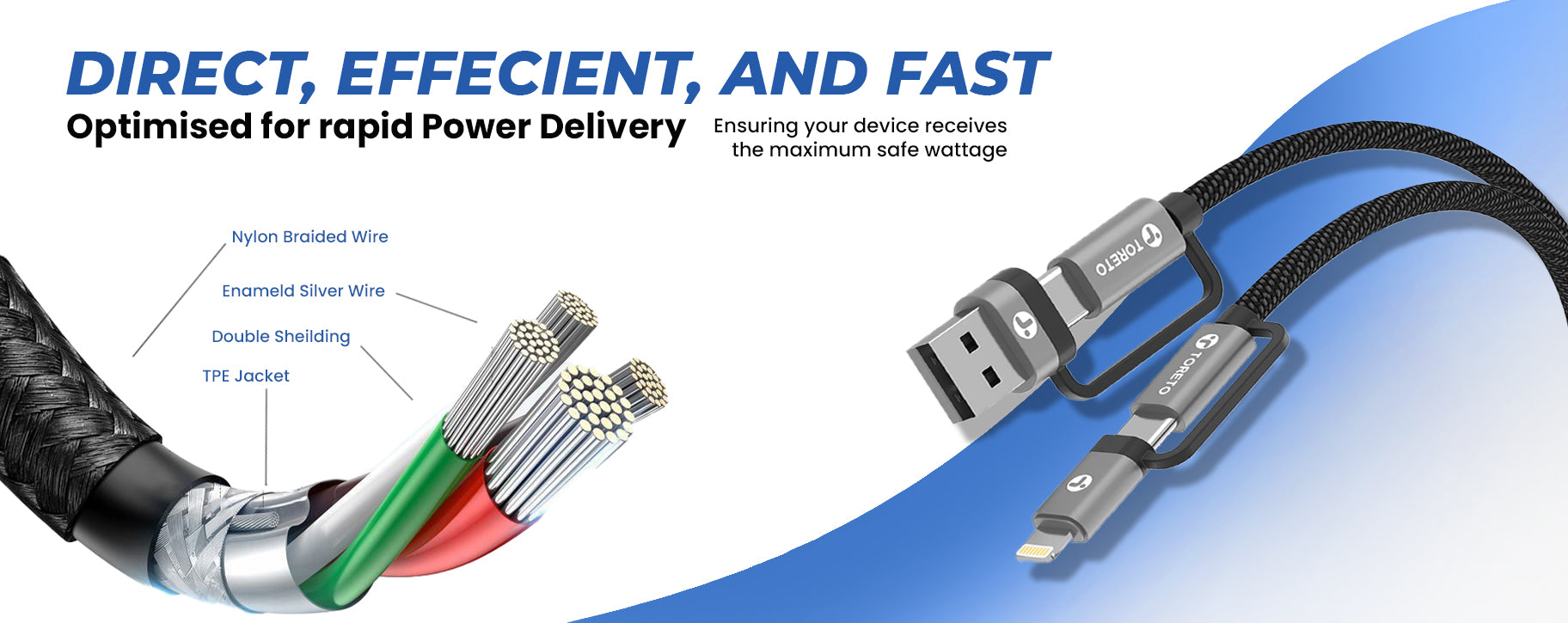 The Toreto TuffCord 3 cable is built with nylon braided wire and metal connectors, supporting over 30,000 bends for long-lasting use.