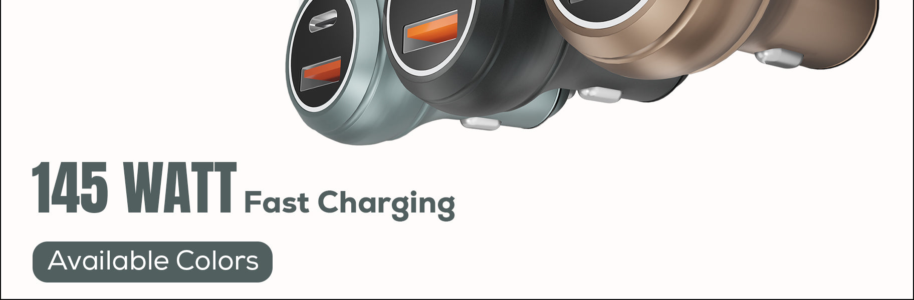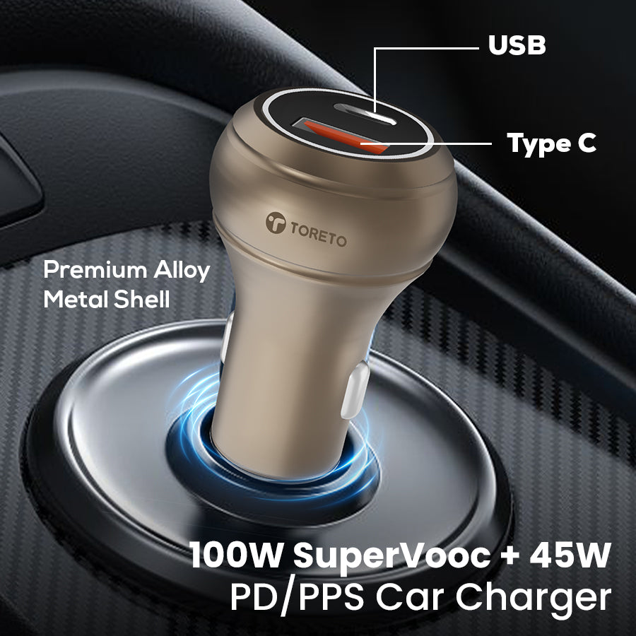 145W fast car charger with Flash and SuperVOOC charging support, dual output ports, premium alloy metal build, and wide device compatibility