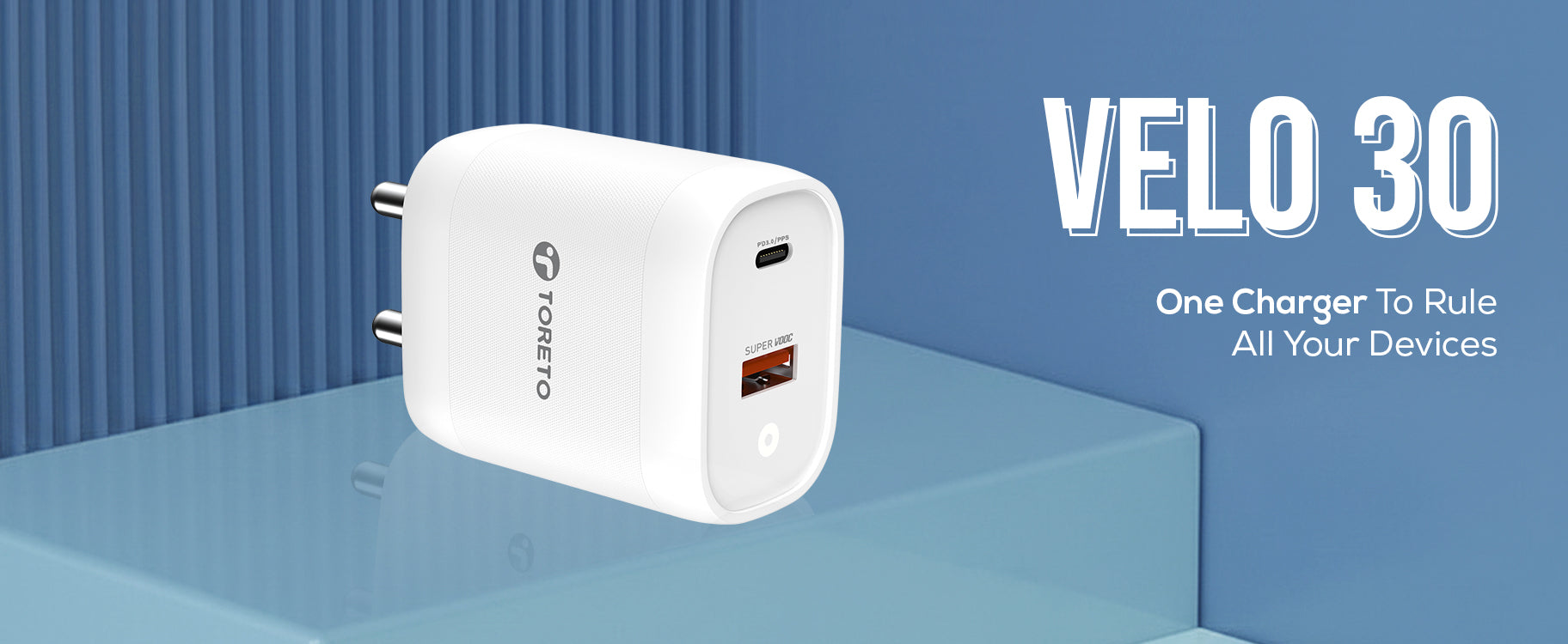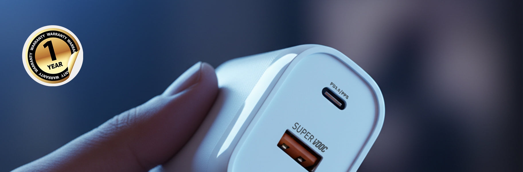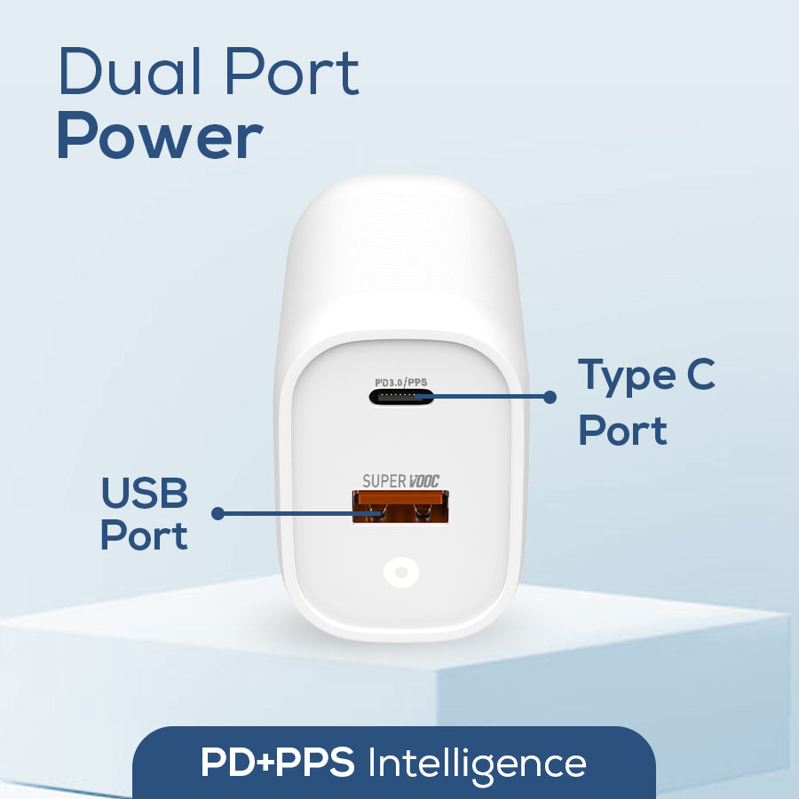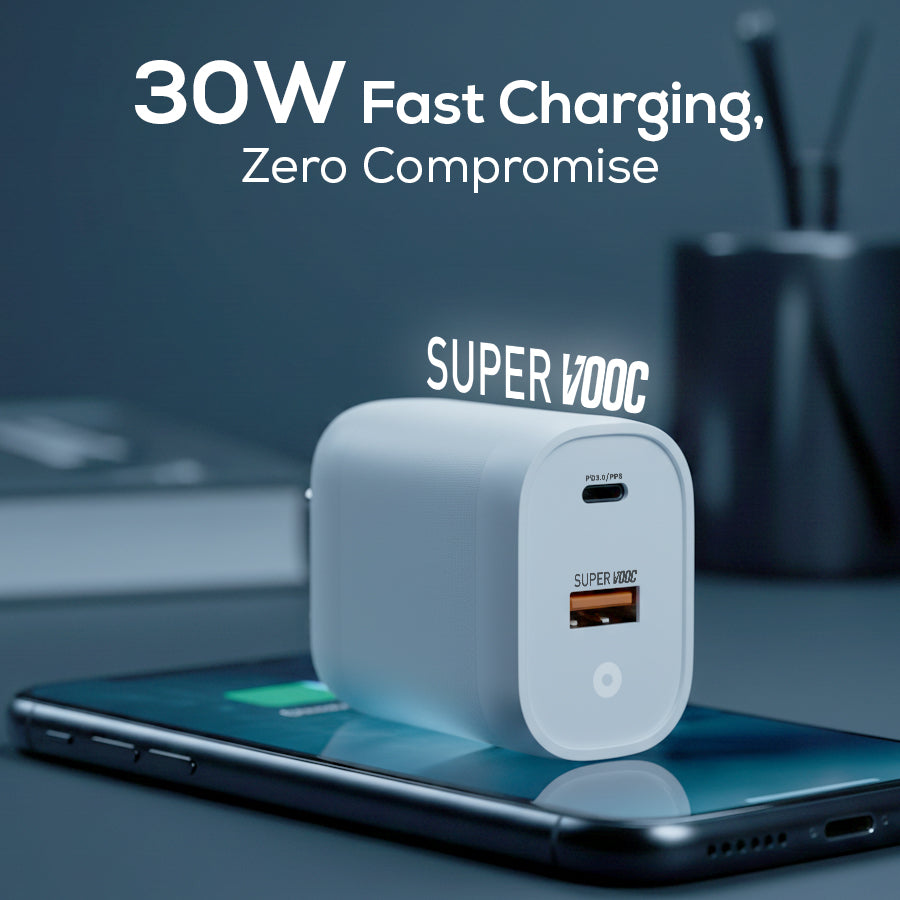 30W fast charging wall adapter with PD + PPS 3.0 intelligence, SuperVOOC fast charging support, dual USB and Type-C output ports, wide voltage input range, and durable ABS body